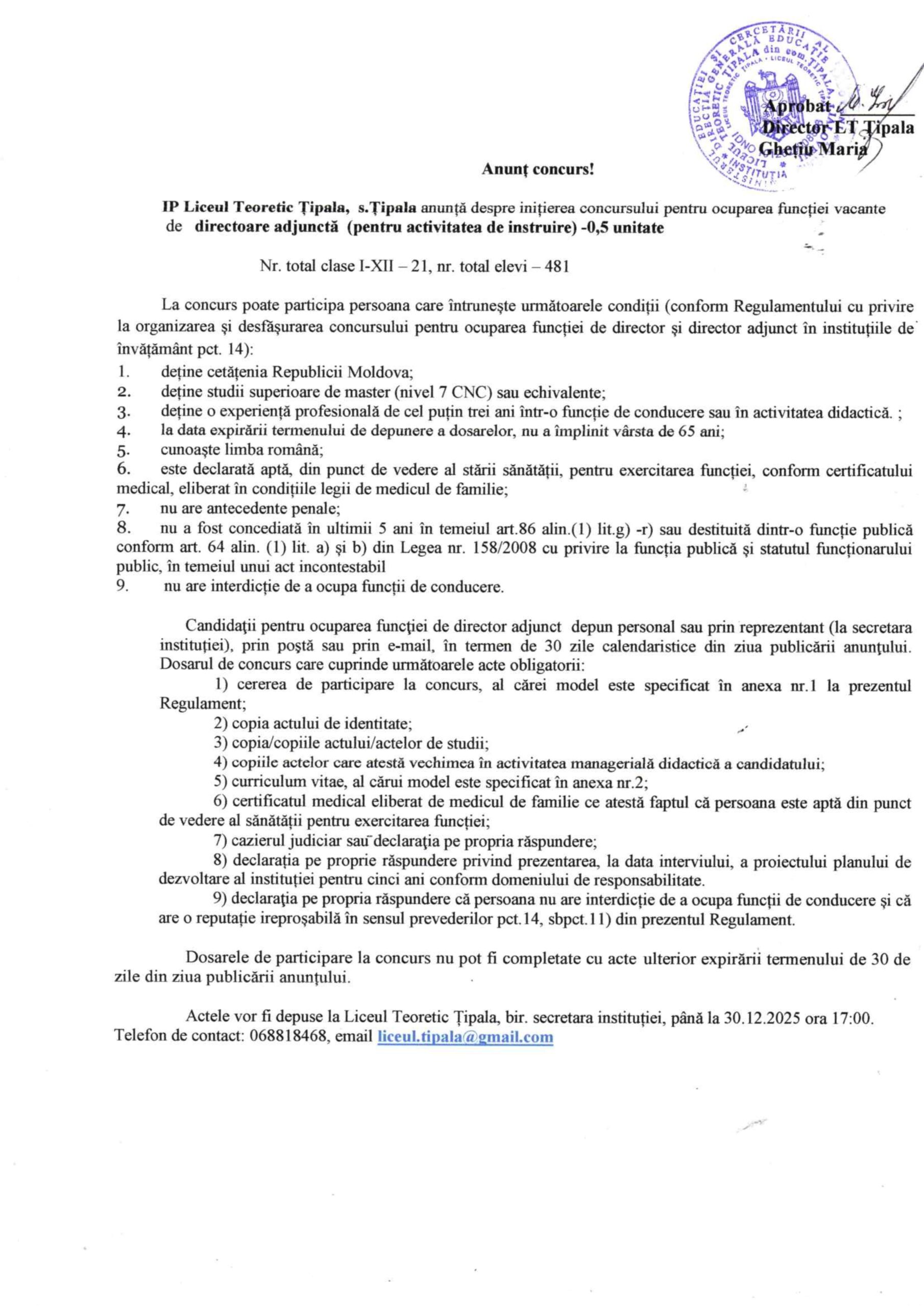 Anunț cu privire la inițierea concursului pentru ocuparea funcției vacante de director adjunct al IP Liceul Teoretic Țipala