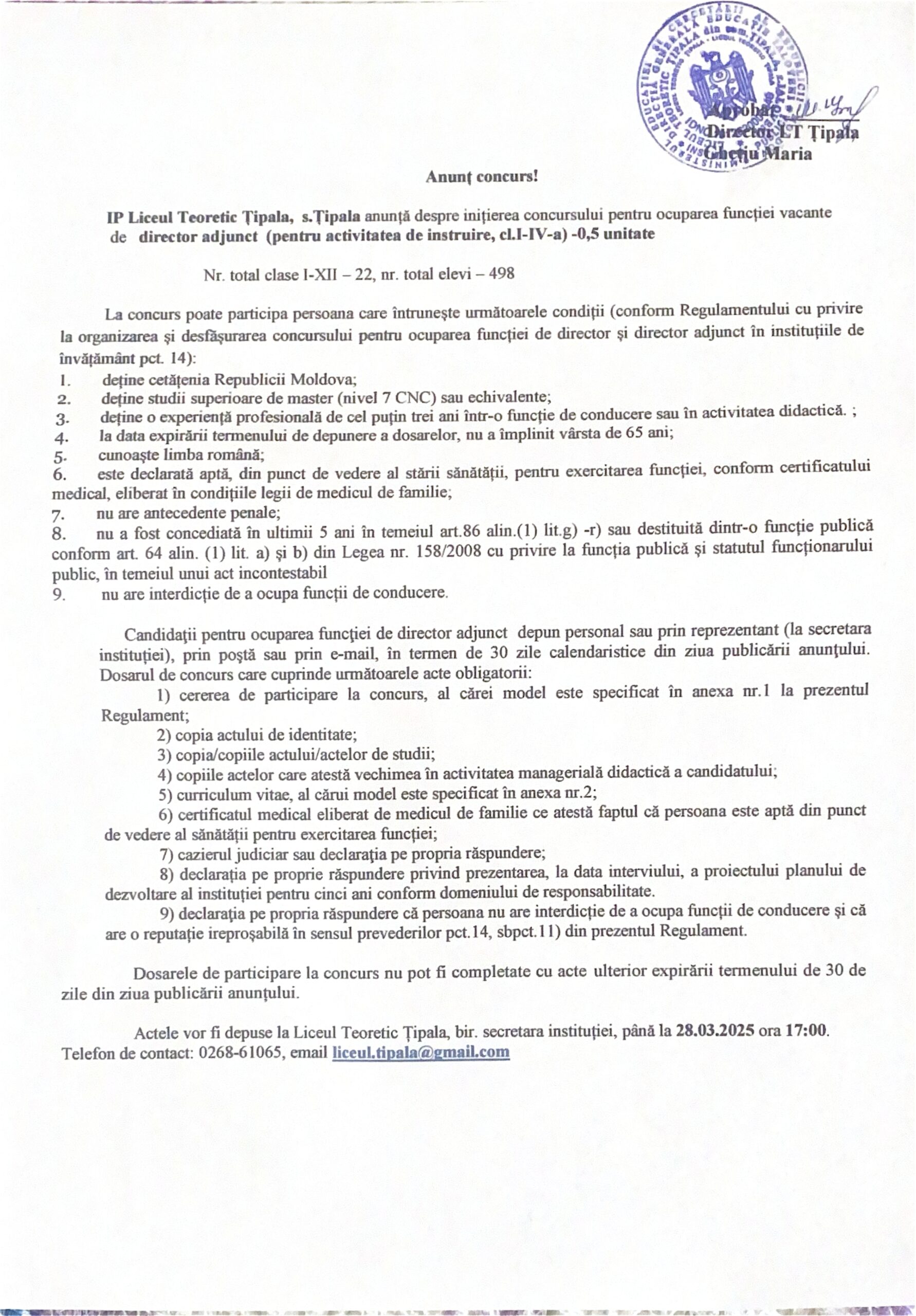 Anunț cu privire la inițierea concursului pentru ocuparea funcției vacante de director adjunct al Liceului Teoretic Țipala, s.Țipala