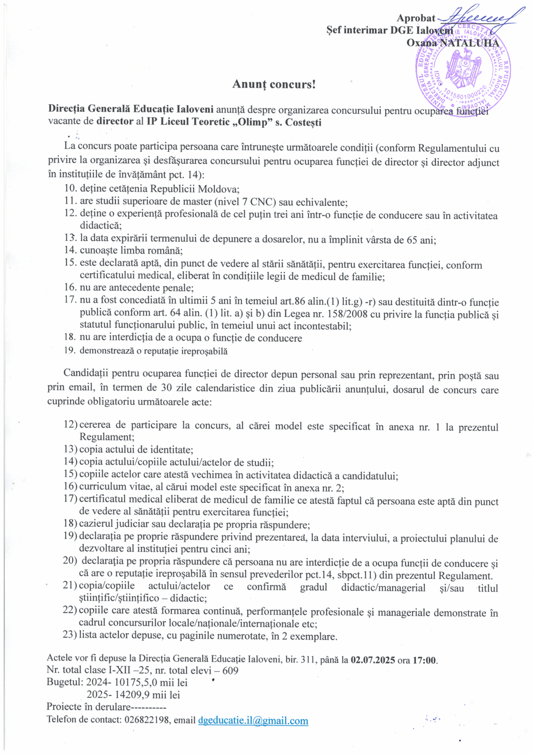 Anunț cu privire la organizarea concursului pentru ocuparea funcției vacante de director al IP Liceulului Teoretic „Olimp” s. Costești