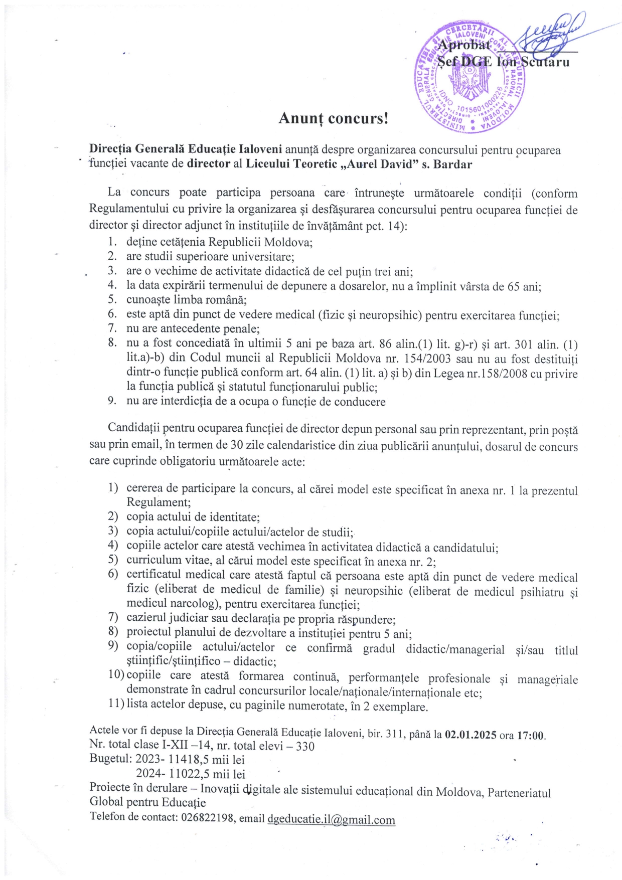 Anunț cu privire la organizarea concursului pentru ocuparea funcției vacante de director al Liceului Teoretic ,,Aurel David”, s. Bardar