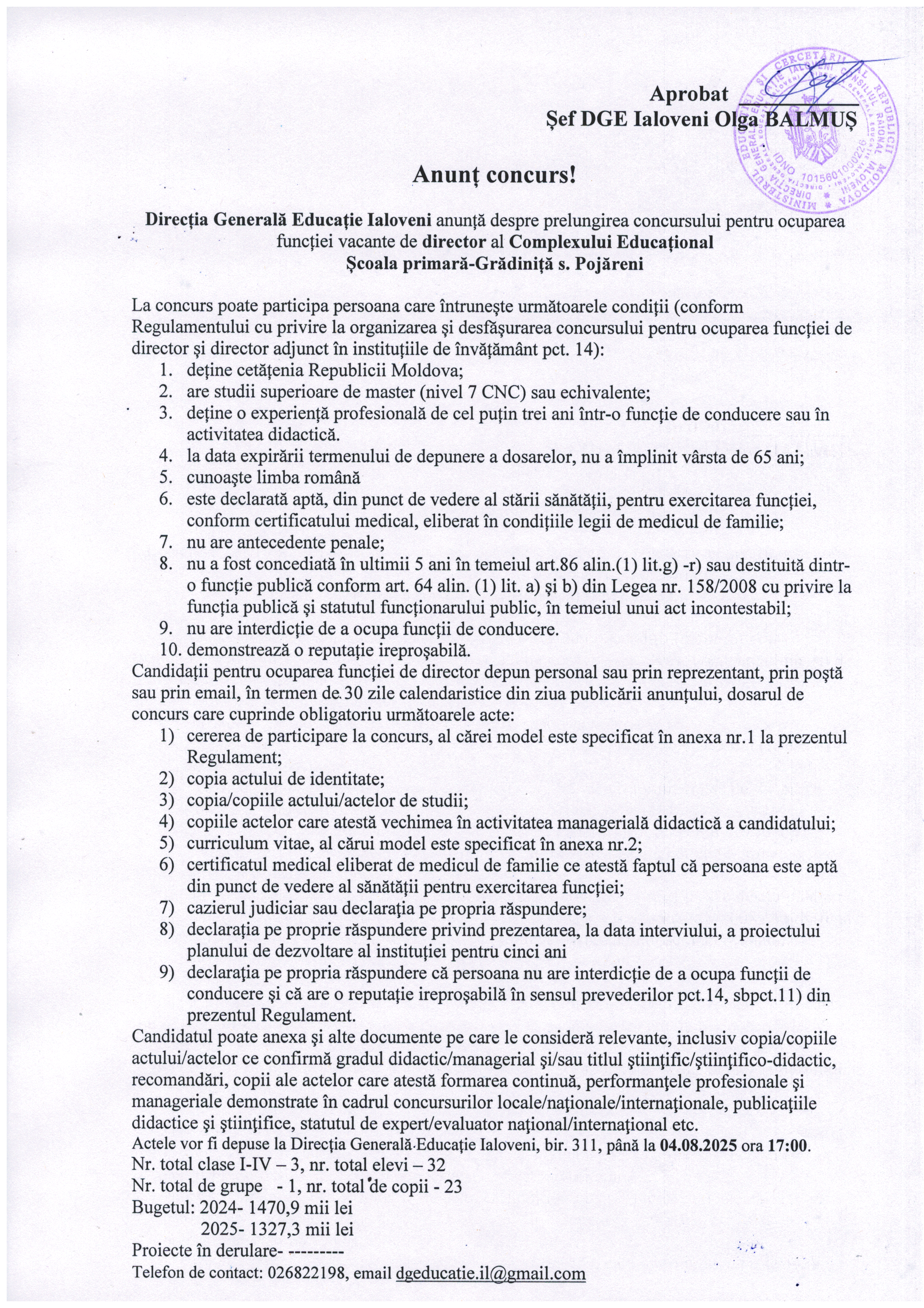 Anunț cu privire la prelungirea concursului pentru ocuparea funcției vacante de director al Complexului Educațional Școala primară-Grădinița s.Pojăreni