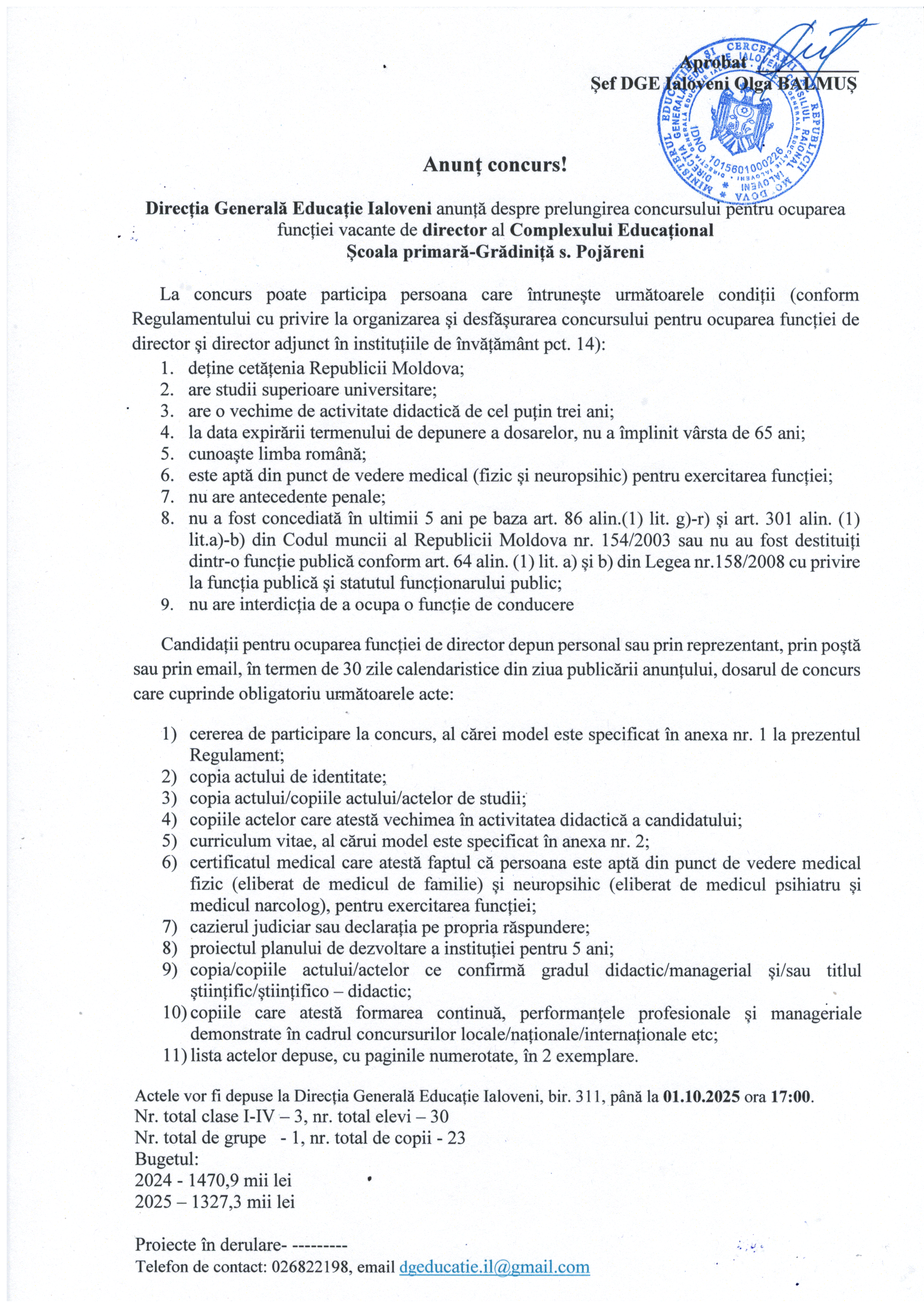 Anunț cu privire la prelungirea concursului pentru ocuparea funcției vacante de director al Complexului Educațional Școala primară-Grădiniță s.Pojăreni