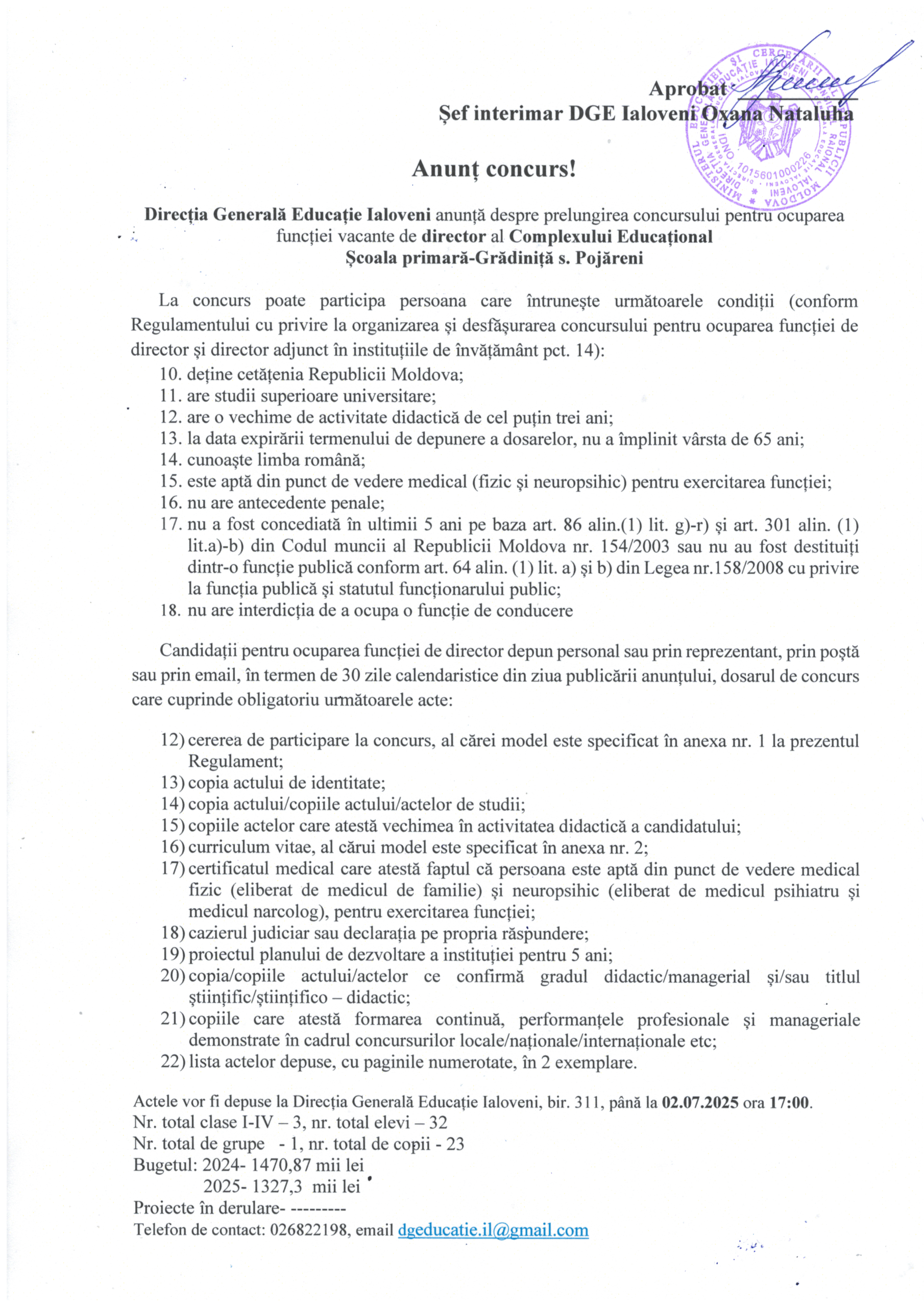 Anunț cu privire la prelungirea concursului pentru ocuparea funcției vacante de director al Complexului Educațional Școala primară-Grădiniță s. Pojăreni