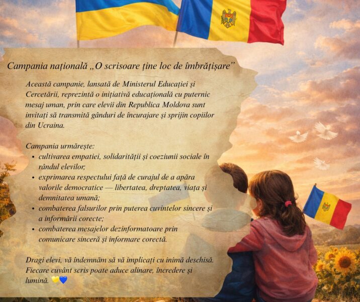 Campania națională „O scrisoare ține loc de îmbrățișare”, lansată de Ministerul Educației și Cercetării, este o inițiativă educațională cu puternic mesaj uman, prin care elevii din Republica Moldova sunt invitați să transmită gânduri de încurajare și sprijin copiilor din Ucraina.