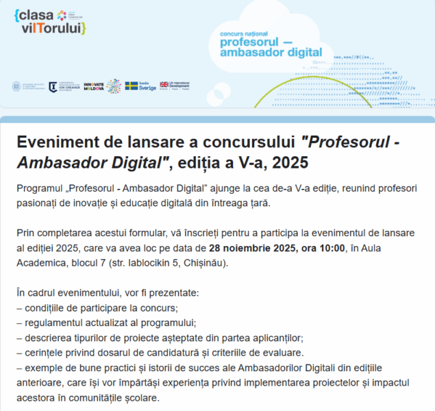 Vă încurajăm să participați la Concursul „Profesorul – Ambasador Digital”, ediția a V-a (2025) – o inițiativă care promovează inovația, creativitatea și integrarea tehnologiei în educație.