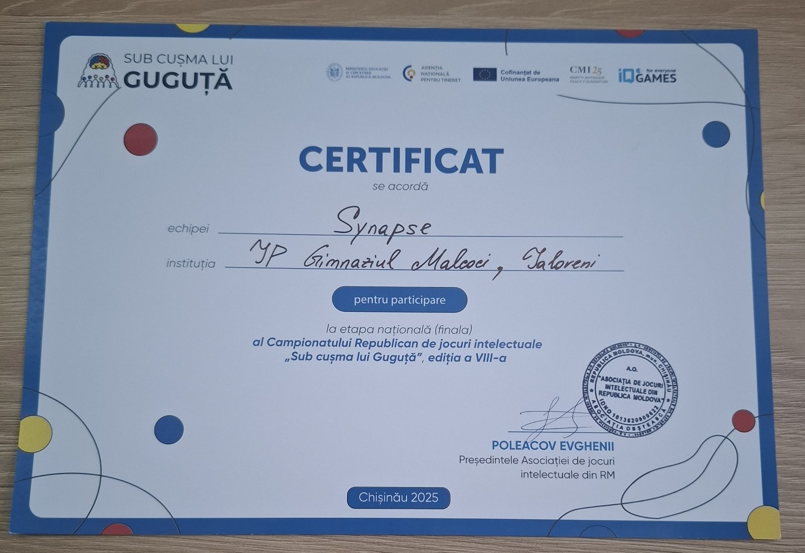 Echipa a participat cu succes la etapa națională (finală) a Campionatului Republican de Jocuri Intelectuale „Sub cușma lui Guguță”, ediția a VIII-a, demonstrând inteligență, implicare și spirit competitiv.