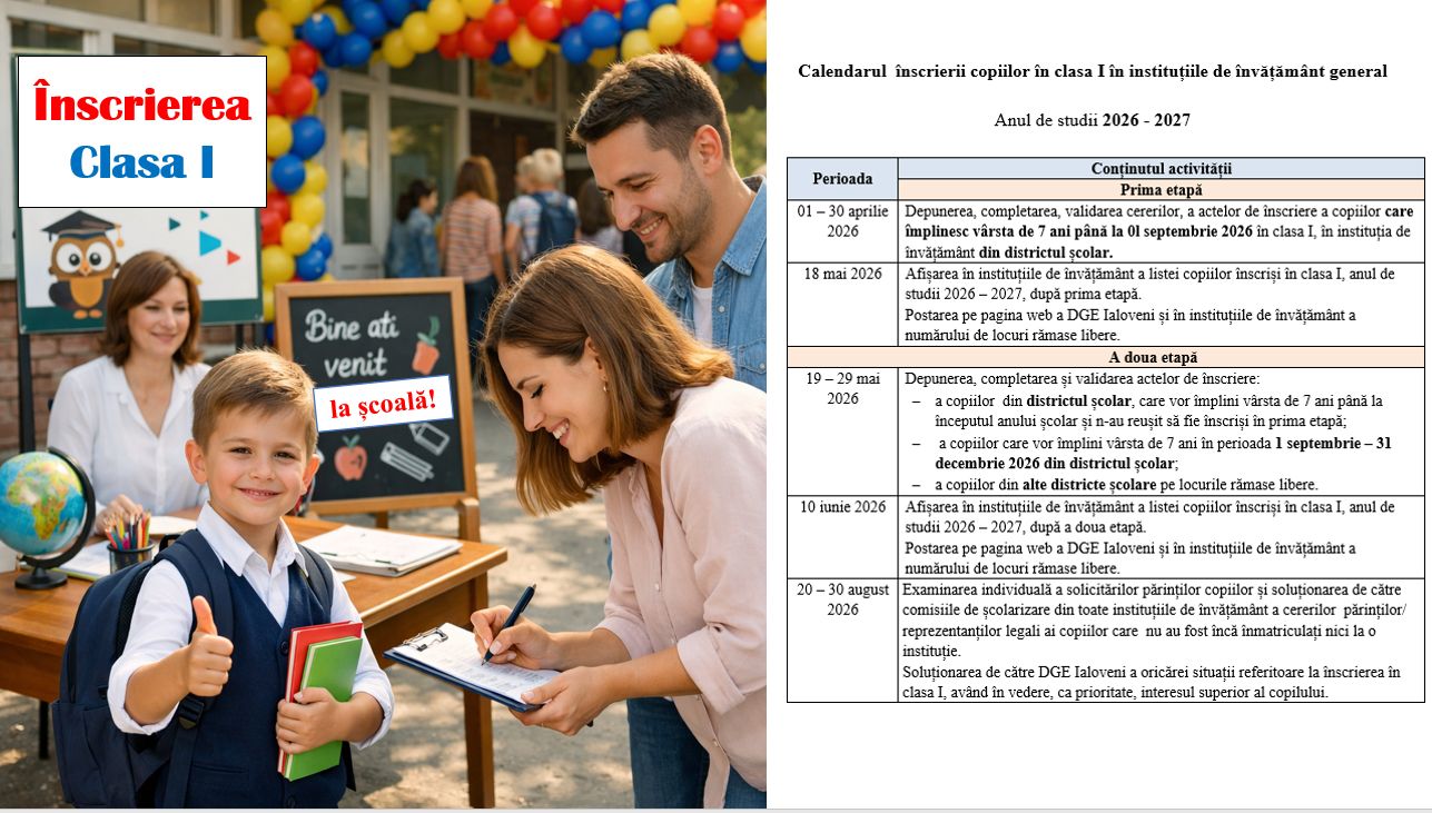 Direcția Generală Educație informează că procesul de înscriere a copiilor în clasa I pentru anul de studii 2026–2027 va începe la 1 aprilie 2026 și se va desfășura în două etape, conform calendarului aprobat de Ministerul Educației și Cercetării.